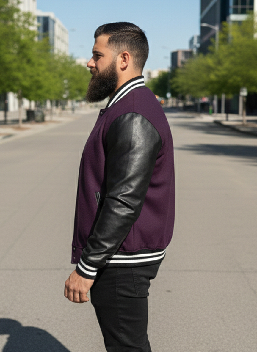 Purple and Black Varsity Jacket Stylish & Comfortable with Leather Sleeves