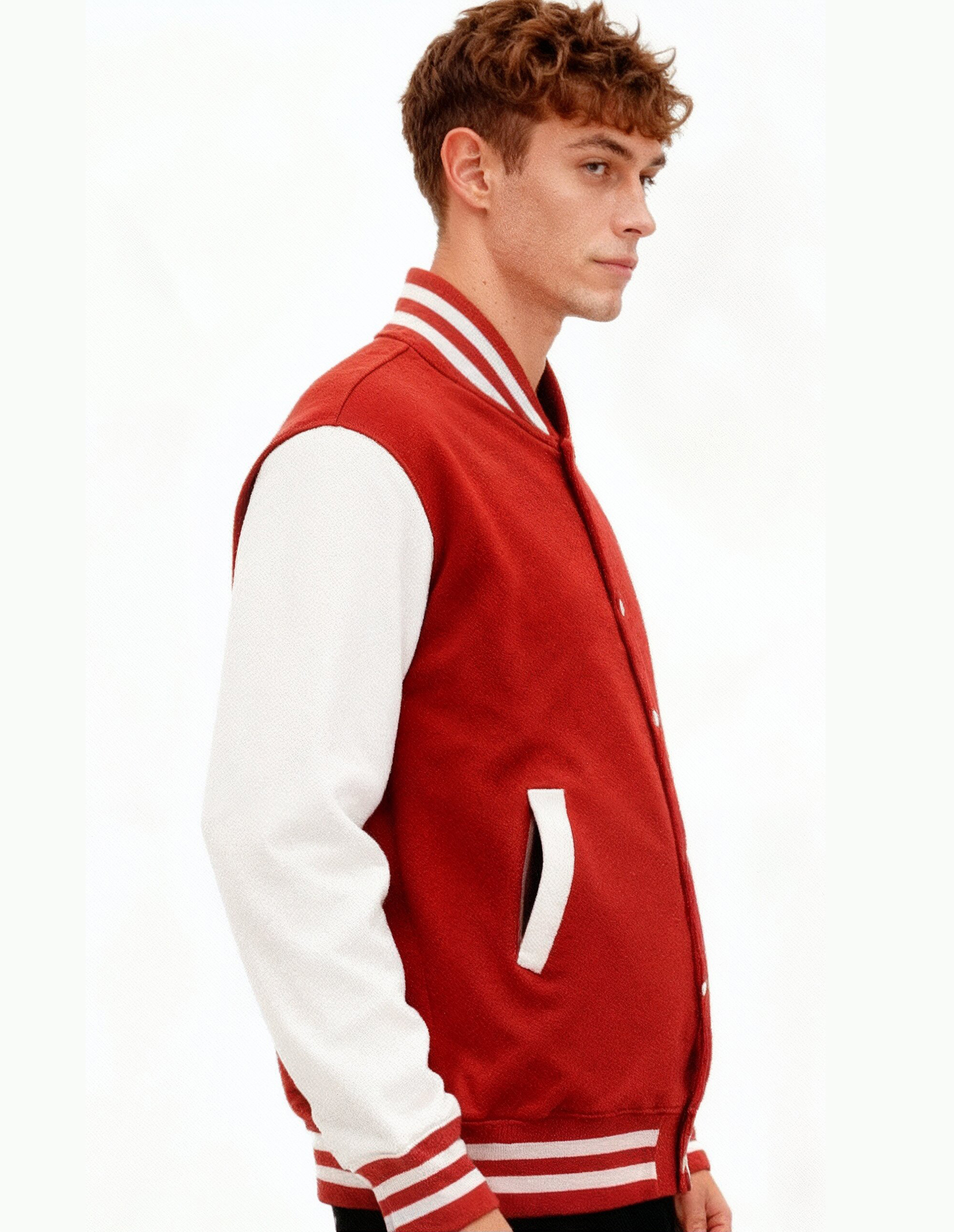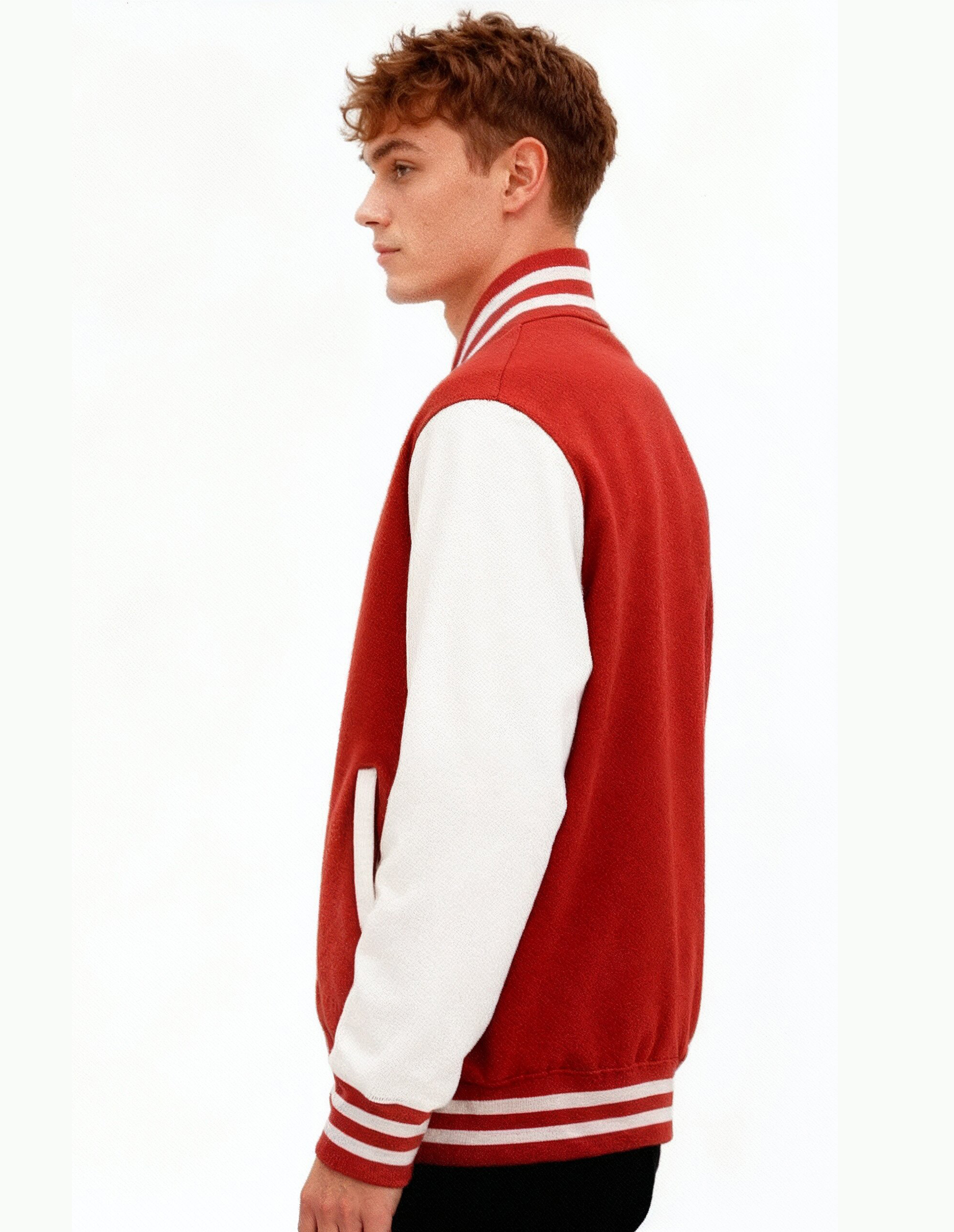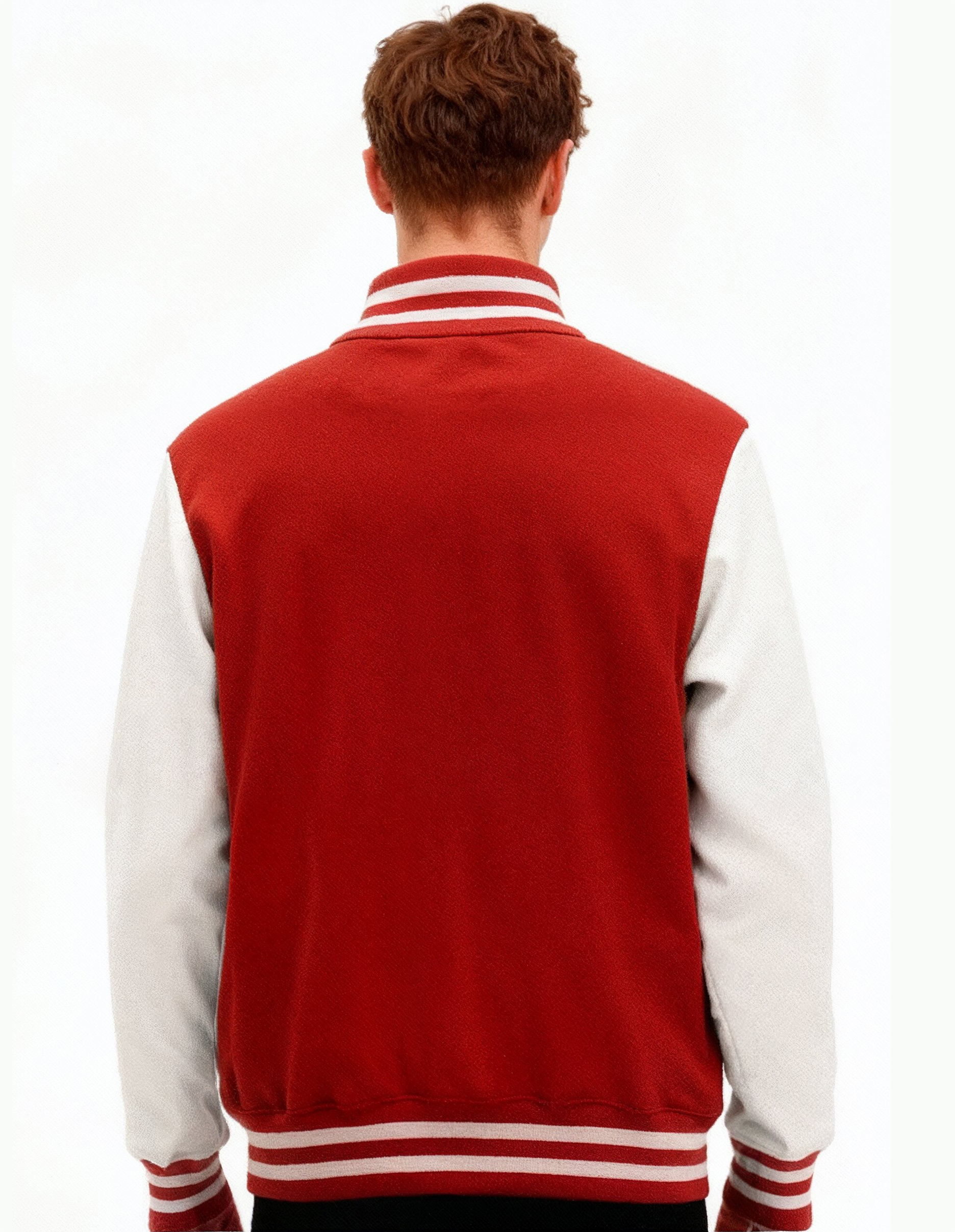 Each custom red white varsity bomber jacket is made from a high quality wool body combined with genuine leather sleeves. This blend provides unmatched warmth, comfort, and durability, giving you that classic varsity appeal that lasts for years.