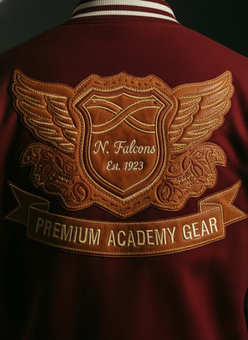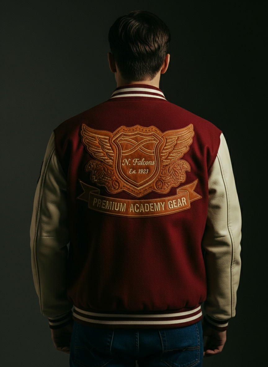 Stylish Embroideries: Features unique and bold patches such as the “N. Falcons” emblem, giving it a distinct varsity look.